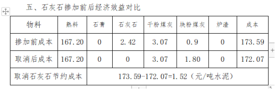 從上表看出,取消石灰石摻加后,噸水泥成本節(jié)約1.52元,按日產(chǎn)4000噸水泥計(jì)算,日節(jié)約成本6080元,年生產(chǎn)80萬(wàn)噸計(jì)算,節(jié)約成本121.6百萬(wàn)元。
