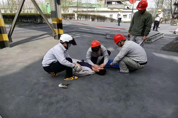 本次演練模擬以煤氣泄漏、人員中毒為方案開展的應(yīng)急救援演練,電石二裝置中控室操作人員發(fā)現(xiàn)3#凈化刮板機(jī)故障,通知兩名巡檢人員攜帶報(bào)警儀及防毒面具至現(xiàn)場檢查設(shè)備故障原因,前方行走人員至四層樓梯口處看見刮板機(jī)側(cè)板磨穿,刮板機(jī)卡住,由于未打開一氧化碳報(bào)警儀,未及時(shí)發(fā)現(xiàn)煤氣泄漏,上前查看時(shí)吸入煤氣中毒暈倒,后方協(xié)同巡檢人員發(fā)現(xiàn)后逐級進(jìn)行匯報(bào),公司迅速啟動(dòng)了應(yīng)急預(yù)案,按照預(yù)案對事故現(xiàn)場進(jìn)行了封鎖、檢查及搶修,在整個(gè)演練過程中,應(yīng)急救援的物資裝備及時(shí)到位,參加演練的各專業(yè)隊(duì)伍行動(dòng)迅速,采取的救援行動(dòng)基本恰當(dāng)。