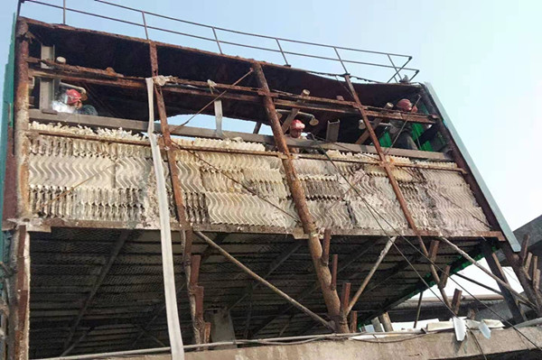 在完成相關(guān)作業(yè)的準(zhǔn)備工作,穿戴好各類防護(hù)用品,簽發(fā)了各類票證后,大家就進(jìn)入到檢修現(xiàn)場(chǎng)。加固冷卻塔前,必須先拆除冷卻塔壁板,清洗冷卻塔填料雜物及易燃易爆物質(zhì)。由于冷卻塔結(jié)構(gòu)腐蝕嚴(yán)重,填料內(nèi)部含易燃易爆物質(zhì)多,所以必須對(duì)冷卻塔進(jìn)行多次沖洗徹底除去易燃易爆物質(zhì)才能進(jìn)行動(dòng)火加固作業(yè)。