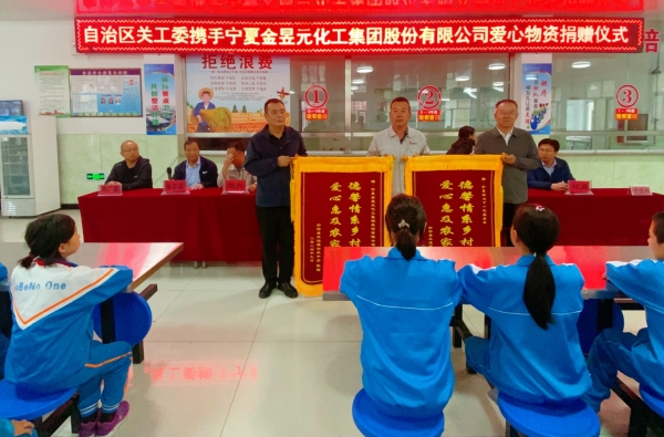 彭陽縣王洼鎮(zhèn)中學(xué)校長虎維林向?qū)幭年P(guān)心下一代基金會、寧夏金昱元化工集團股份有限公司贈送錦旗。