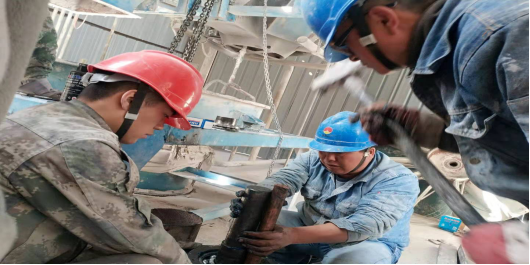 在其他設(shè)備檢維修現(xiàn)場(chǎng),工人們依然具備這種“責(zé)任心”,如生料裝置接力風(fēng)機(jī)維修現(xiàn)場(chǎng),檢維修工人通過測(cè)振儀更換“主軸”。