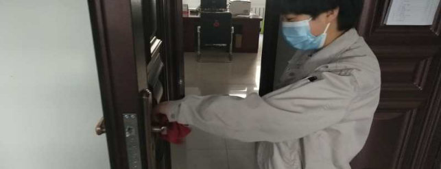 擦拭操作臺、門把手,工作的有條不紊。