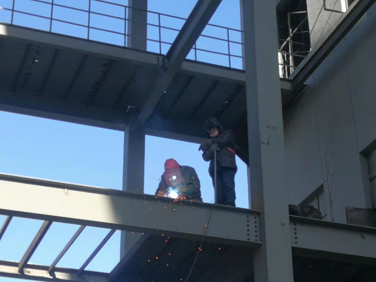清晨的天,陰沉沉的。雖然跟前幾天比起來溫度有所回升,但呼呼的北風(fēng)還是讓人感覺寒冷。走進(jìn)技改現(xiàn)場,龐大的吊車正在吊裝作業(yè)。高高的原料輸送斜廊上幾個(gè)身影系著安全帶等待著彩板的到來。吊車旁邊的指揮者,穿著厚厚的棉襖,拿著對講機(jī),高高的仰著頭在觀察吊物情況,確保吊裝過程的安全。我抬頭仰望,數(shù)十米高的平臺上,幾個(gè)身影若隱若現(xiàn),隱約能看到他們的安全帽在鋼結(jié)構(gòu)后面來回躍動(dòng)。