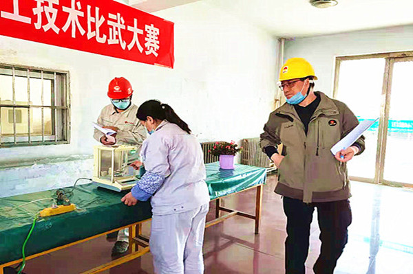 比賽現(xiàn)場女職工熟練的操作技能,沉著冷靜,對電石破碎樣品進行計量稱重;對工作一絲不茍,嚴(yán)格把控電石發(fā)氣量。