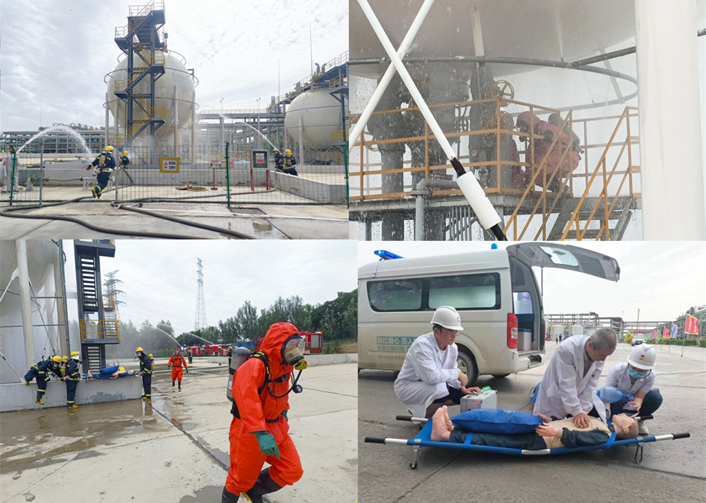 本次演練主要內(nèi)容是:2023年6月28日,金昱元廣拓能源有限公司2#罐區(qū)氯乙烯單體球罐發(fā)生泄露,在裝置處置過程中,搶修人員出現(xiàn)中毒癥狀,隨著泄露量的不斷增大,泄漏點(diǎn)突然起火,造成人員傷亡。在應(yīng)急指揮部的科學(xué)決策、正確指揮下,經(jīng)過廣拓能源公司及多方應(yīng)急救援力量的協(xié)同配合下,這一起危險化學(xué)品泄露燃爆事故最終得到了成功處置。