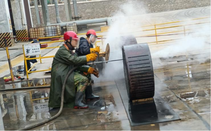 檢修已經(jīng)是第三天,接近尾聲,大家似乎已經(jīng)疲憊,但是行動(dòng)上未松懈。今日的氯化氫小廣場(chǎng)上格外熱鬧,7:20,班長(zhǎng)已經(jīng)開始準(zhǔn)備今日的檢修票證,為檢修項(xiàng)目做準(zhǔn)備。他的身影在朝陽(yáng)地映射下顯得那么著急,沒有一點(diǎn)怠慢的意思,今天我們班組檢修的項(xiàng)目是提濃塔再沸器石墨塊疏通工作,這項(xiàng)工作看起來(lái)簡(jiǎn)單,實(shí)際上是耐心地考驗(yàn)。一個(gè)個(gè)細(xì)小的石墨孔需要用蒸汽一個(gè)一個(gè)疏通,檢修開始之前還是和往常一樣,安全教育是少不了的,班長(zhǎng)一遍遍強(qiáng)調(diào)防護(hù)用品規(guī)范佩戴以及疏通過程中的安全注意事項(xiàng),在準(zhǔn)備工作結(jié)束后,今天的檢修工作開始了。