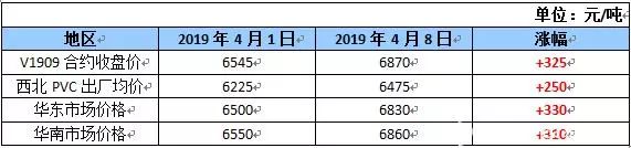 沉寂3個(gè)月的PVC,踏入4月后表現(xiàn)可謂突飛猛進(jìn)。尤其在PVC期貨實(shí)現(xiàn)移倉(cāng)換月后,漲價(jià)動(dòng)能得到充分激發(fā),大舉突破震蕩狀態(tài),從4月1日至4月8日,大商所V1909合約收盤(pán)價(jià)漲幅近5.0%。而PVC生產(chǎn)廠家在庫(kù)存低位的情況下看漲情緒較強(qiáng),助推漲價(jià)潮在短時(shí)間內(nèi)愈演愈烈。