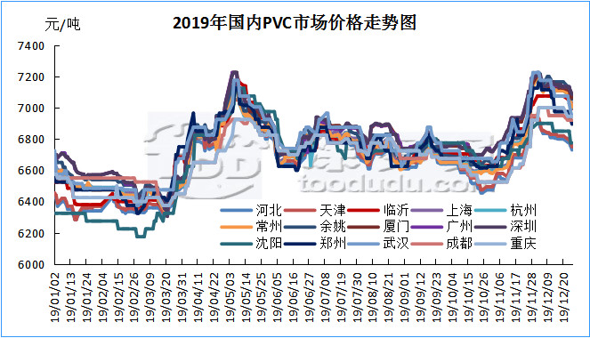2019年中國國內(nèi)PVC市場(chǎng)仍舊是價(jià)格高位整理的一年,全年價(jià)格波動(dòng)區(qū)間以華東主流為例在6440-7225元/噸之間,高低價(jià)差785元,從走勢(shì)圖以及月均價(jià)走勢(shì)可以看出,2019全年經(jīng)歷兩撥較大幅度的推漲,其中第一季度1-3月份市場(chǎng)較為低迷,處于低谷整理期,4月份開始市場(chǎng)價(jià)格開始緩慢上漲,經(jīng)歷不斷的上漲價(jià)格在5月中旬開始達(dá)到年內(nèi)第一次高點(diǎn),價(jià)格達(dá)到高點(diǎn)后,需方承受能力有限,價(jià)格開始下行,下行至6月中下旬后,市場(chǎng)開始進(jìn)入緩慢的整理期,長達(dá)4個(gè)月,6月中下旬-10月中旬,價(jià)格一直處于小幅震蕩整理中,供需雙方的博弈一度令PVC整體產(chǎn)業(yè)鏈進(jìn)入迷茫期,多數(shù)行業(yè)內(nèi)人士甚至認(rèn)為PVC產(chǎn)品的下跌大周期開始來臨,我們回顧下往年的PVC行情,其價(jià)格在15年5月初達(dá)到最低點(diǎn)后內(nèi)蒙出廠4350元/噸含稅,價(jià)格在歷史低點(diǎn)后開始不斷反彈,在經(jīng)歷了16-18年的整理后,在19年中國國內(nèi)PVC市場(chǎng)仍占據(jù)高點(diǎn),四年間PVC生產(chǎn)企業(yè)賺的盆滿缽滿。但下游制品企業(yè)卻苦不堪言,并且自18年國家稅控改革以來,次終端貿(mào)易商對(duì)稅票逐漸失去控制,導(dǎo)致次終端利潤不斷下滑,規(guī)范的市場(chǎng)導(dǎo)致票貨分離減少。而在整個(gè)PVC產(chǎn)業(yè)鏈中,生產(chǎn)企業(yè)占據(jù)越來越多的話語權(quán),從而導(dǎo)致了雖然我們看到在迷茫期過后,第四季度國內(nèi)PVC市場(chǎng)仍舊迎來年底第二次大漲,此次上漲把PVC價(jià)格推上了真正的年底高點(diǎn)。第四季度的上漲導(dǎo)火線為內(nèi)蒙企業(yè)裝置出現(xiàn)意外事件停產(chǎn),市場(chǎng)炒作聲漸起,價(jià)格開始上漲,而隨后的11-12月份,在期貨的帶動(dòng)下,價(jià)格不斷被推上新高。12月中旬需方面對(duì)如此高的價(jià)格開始產(chǎn)生抵觸心理。而此時(shí)的年度備貨來臨,市場(chǎng)不但沒有復(fù)漲反而開始進(jìn)入蕭條期,價(jià)格開始下滑。