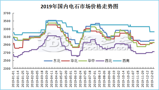 2019年中國國內(nèi)電石走勢(shì)上半年跟隨PVC走勢(shì)類似,第一季度震蕩上行整理,4月份到達(dá)年度高點(diǎn),但隨后價(jià)格開始下行,下行至6月中旬又開始震蕩上漲,隨后的三四季度震蕩走低中。整體來看作為PVC上游原料,電石的走勢(shì)類似于PVC走勢(shì),但并不完全相同,尤其下半年,我們可以推測(cè),下面的PVC收到資金以及市場(chǎng)炒作以及期貨方面的影響較大,并不是從供需、原料方面受到影響。