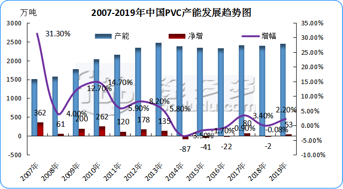 2.1 2007年-2019年中國聚氯乙烯產(chǎn)能走勢(shì)圖
