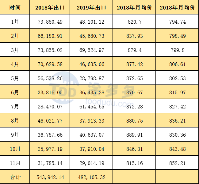 2019年1-11月累計(jì)出口數(shù)量為482105.32噸,同比去年減少61836.82噸。跌幅11.37%,進(jìn)出口抵消來看,國內(nèi)市場(chǎng)供需變化不大。出口數(shù)量的減少彌補(bǔ)了進(jìn)口的減少。
