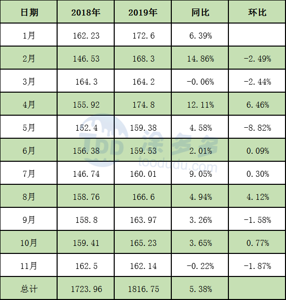 2019年1-11月PVC累計(jì)產(chǎn)量1816.75萬噸,同比去年減少92.79噸。漲幅5.38%,產(chǎn)能的凈增是產(chǎn)量增加的主要原因。