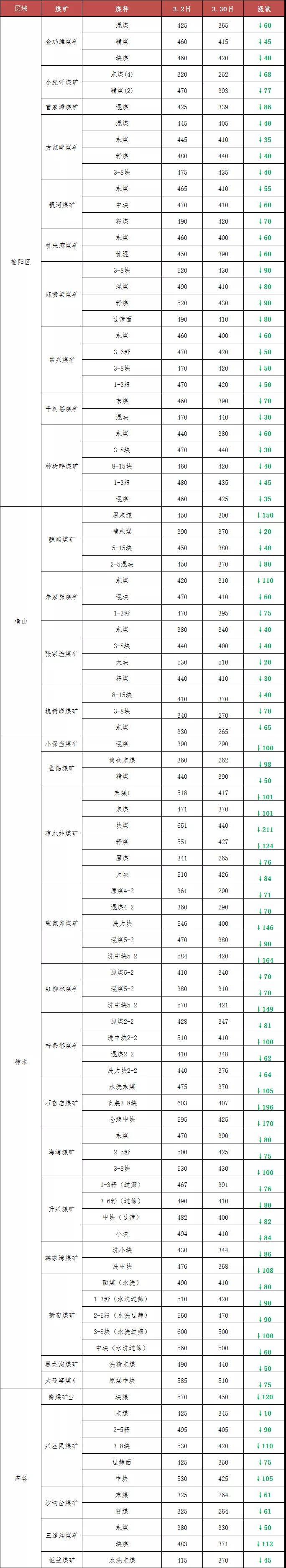 ▏倒工作面煤礦:創(chuàng)威煤礦、崔家溝煤礦、石巖溝煤礦 狼窩渠煤礦:接領(lǐng)導(dǎo)通知,3月30日、31日兩天綜采正常生產(chǎn)出煤,31日晚上井下停止開始全面清掃井下衛(wèi)生。 近日,榆林煤價持續(xù)下跌,且有繼續(xù)下跌的可能。有客戶向榆林煤炭交易中心反映,最近下游終端用戶壓價幅度較狠,個別用戶壓價幅度達到90元/噸左右。 下游如此壓價,這無疑是倒逼產(chǎn)地煤礦繼續(xù)降價。 據(jù)榆林煤炭交易中心了解,從3月初到現(xiàn)在,榆林許多煤礦降幅超100元/噸,個別煤礦降幅甚至快接近200元/噸。雖然煤價一直下跌,但據(jù)業(yè)內(nèi)人士分析,目前煤價還未探底,仍有幾十元的下降空間。
