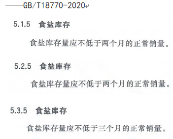 GB/T18770-2020標準提出A、AA級企業(yè)“應(yīng)不低于”二個月正常銷量儲備,AAA級企業(yè)“應(yīng)不低于”三個月正常銷量儲備,井礦鹽區(qū)生產(chǎn)精制鹽按市場需要產(chǎn)出,不象海湖鹽區(qū)產(chǎn)場集中生產(chǎn)堆垛,在目前市場競爭條件下難以實現(xiàn),能夠達到一個月正常銷量食鹽儲備都很不錯了。
