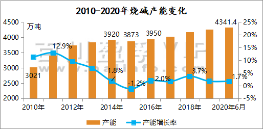 燒堿市場行情走勢與市場供需情況往往存在密切的聯(lián)系,而供應(yīng)方面的變化主要來自于產(chǎn)能的改變,今日我們百川從供應(yīng)角度分析2010-2020年燒堿產(chǎn)能變遷情況;2010-2015年中國燒堿處于飛速擴展,供應(yīng)的激增導致產(chǎn)品價格偏低,2013年開始廠家擴產(chǎn)趨于理性,2015年中國燒堿產(chǎn)能增長率為-1.2%。