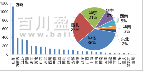 產(chǎn)能:增產(chǎn)集中地為江蘇、內(nèi)蒙古、山東、河北、新疆地區(qū),預(yù)計到2023年,中國燒堿產(chǎn)能約4600-4700萬噸,山東省燒堿產(chǎn)能將逼近1300萬噸,新疆維吾爾自治區(qū)燒堿產(chǎn)能有望突破400萬噸,江蘇、內(nèi)蒙古及新疆三地燒堿生產(chǎn)能力旗鼓相當。