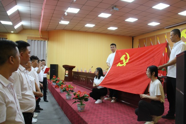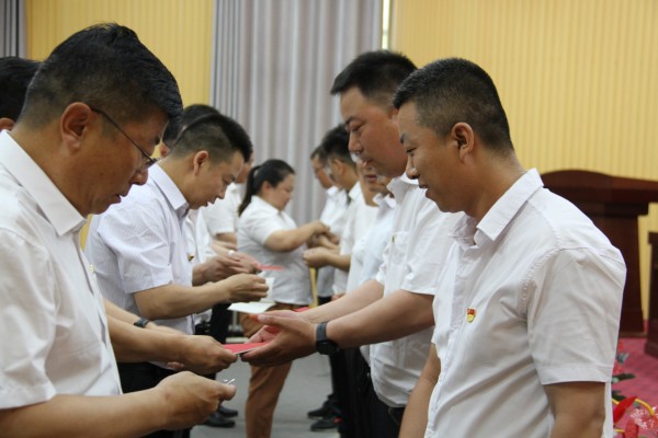 黨委領導班子為新黨員佩戴黨徽,頒發(fā)《黨章》。